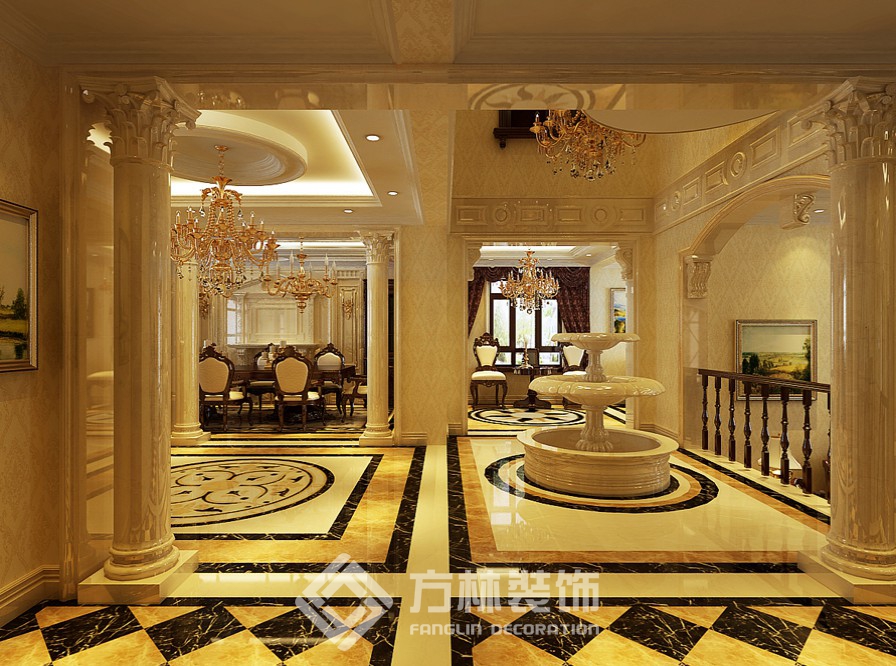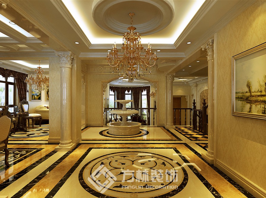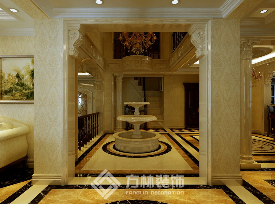 設(shè)計(jì)理念:本案例為歐式風(fēng)格,全大理石瓷磚鋪設(shè),過廊處的噴泉裝飾更加的有藝術(shù)感,暖色的色調(diào)使得整個(gè)房間有家的氛圍