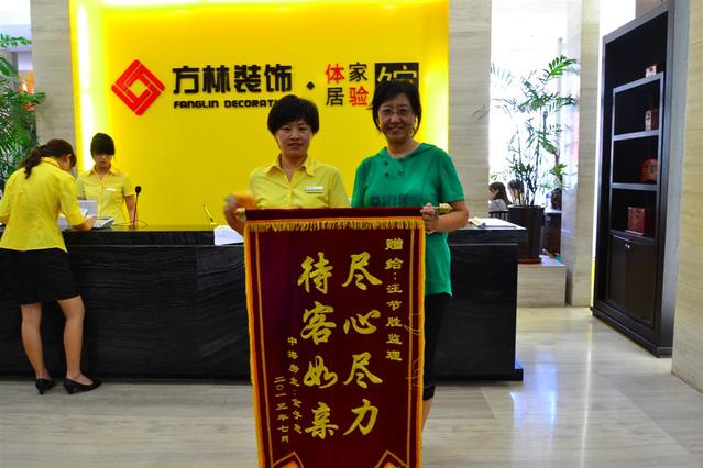 顧客滿意就是對方林裝飾最大的肯定。中海寰宇天下的業(yè)主金女士為表示對方林裝飾汪節(jié)勝監(jiān)理的感激之情,特地送來了一面錦旗,與方林裝飾的副總經(jīng)理謝娜合影留念!