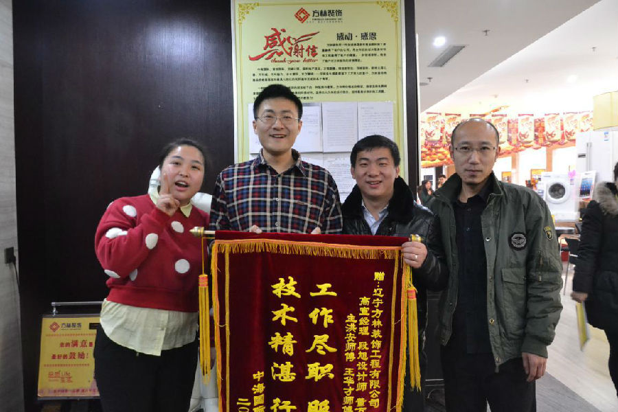 我是來自中海國際社區(qū)的業(yè)主,我家是在今年5月份開始裝修的,中間由于設(shè)計方案改動耽誤了一段時間,現(xiàn)在工程正進行到了瓦工,特別感謝方林裝飾的工人、段旭設(shè)計師、特別是高宣總經(jīng)理,認真負責(zé)無論任何事情任何時間都會幫助你,有時候都晚上9、10點鐘還打電話問問題,他們也不會煩,還主動幫我調(diào)節(jié)一些事,為大家添了很多麻煩。還有就是要感謝網(wǎng)絡(luò)部的董瑩,因為我家是從網(wǎng)絡(luò)上定的裝修,董瑩特別熱情在這兩個月中幫忙量主材的尺寸,拍照片給我,讓我覺得很省心。懷著一顆感恩的心我特意送來一面錦旗,表達我的謝意!