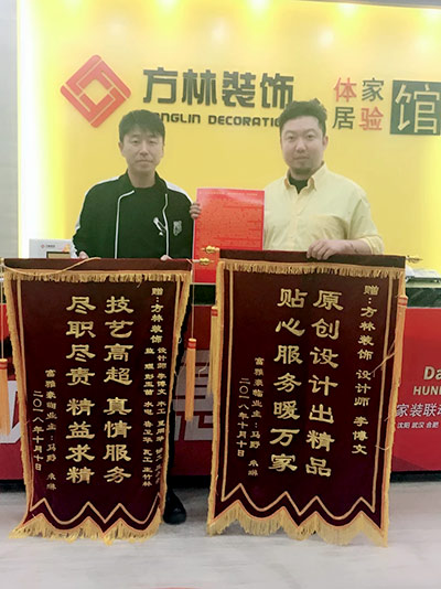 方林裝飾就是好 表揚(yáng)感謝少不了 大家一起來努力 創(chuàng)造輝煌好成績 (富雅豪臨)業(yè)主親自到公司送來錦旗,感謝所有方林工作人員的工作認(rèn)真、負(fù)責(zé),工藝技能的精湛。
