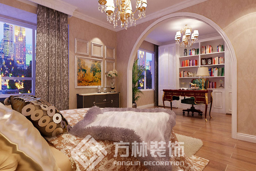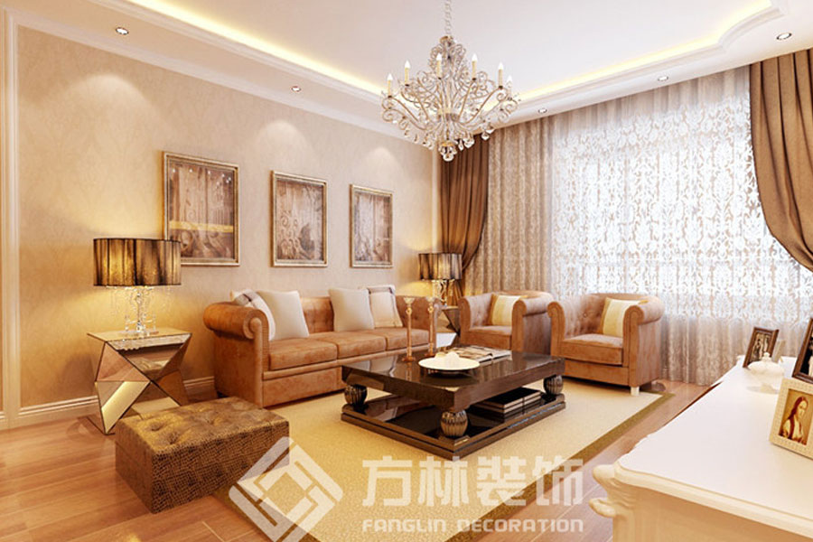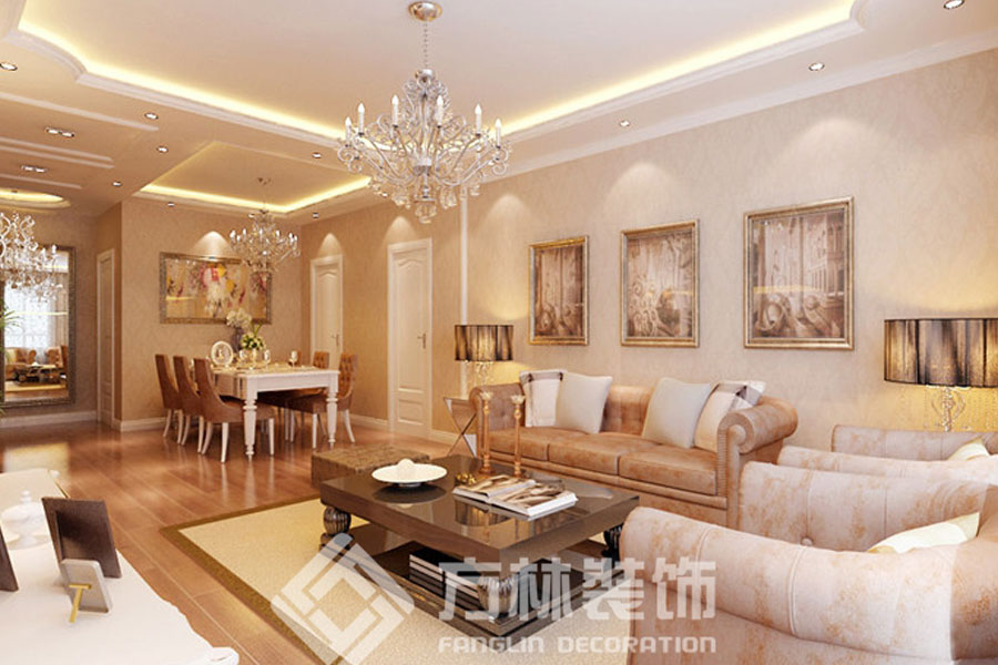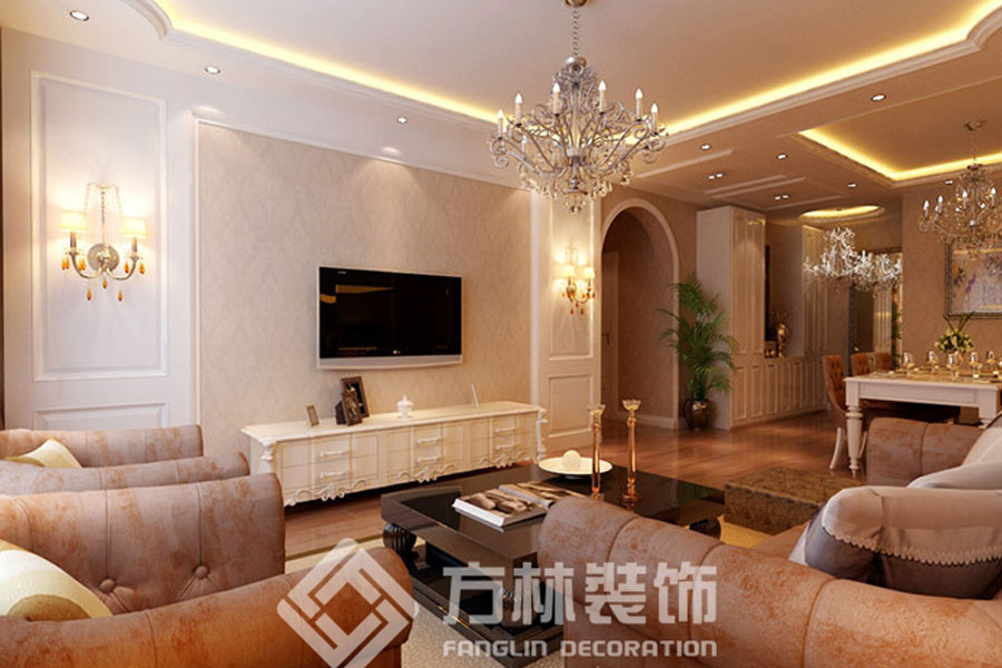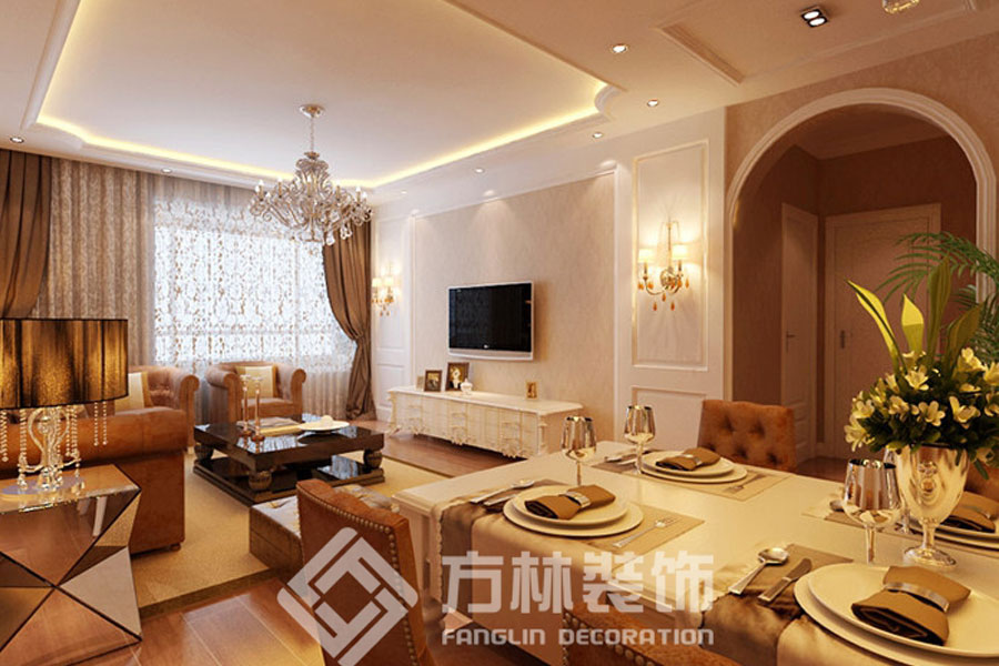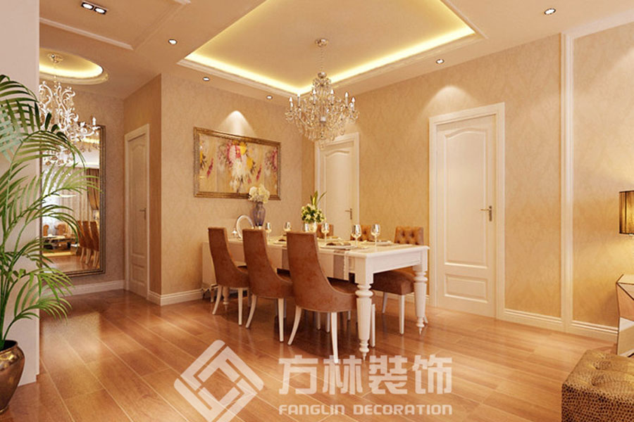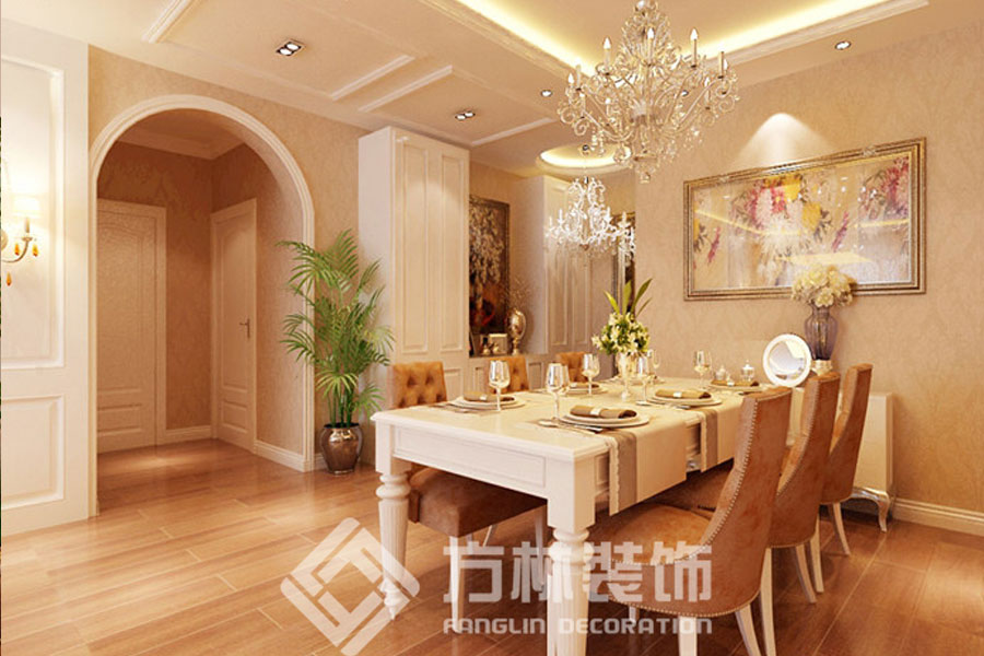 設計理念:此案例整體色調主要以明亮的暖色調為主題,貫穿整個空間,表達一種通透的視覺空間感,同時背景墻的造型凸顯歐式風格的同時沒有表現(xiàn)的過于繁瑣,于客廳棚頂造型進行呼應,承上啟下。讓業(yè)主時刻體會到歐式的優(yōu)雅與浪漫。