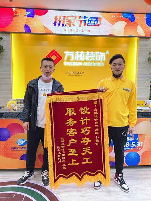 方林裝飾就是好 表揚感謝少不了 大家一起來努力 創(chuàng)造輝煌好成績 益格風(fēng)情灣二期(園區(qū))業(yè)主親自到公司送來錦旗,感謝所有方林工作人員的工作認真、負責(zé),工藝技能的精湛,他們?nèi)胰硕己軡M意 讓我們共同努力,用心服務(wù)好每一位客戶!